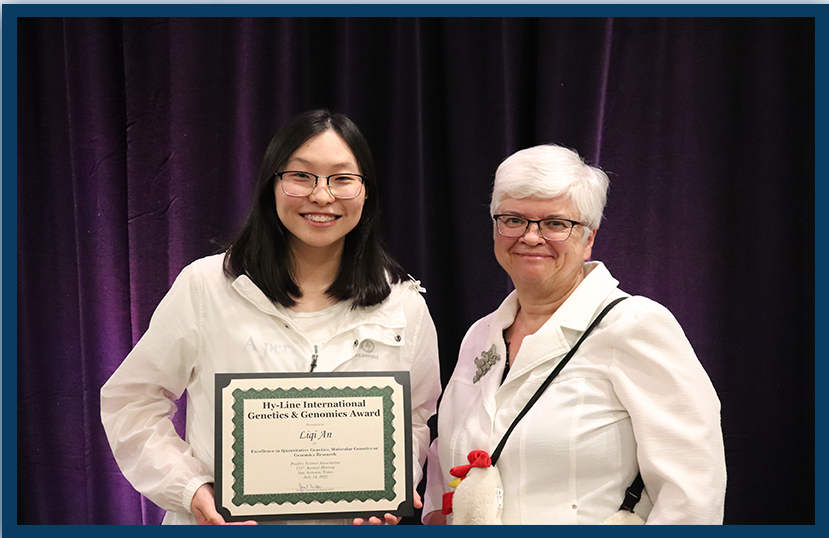 En Julio de 2022, Hy-Line entregó a Liqi An y a Kuan Ling Liu el Premio de Genética y Genómica de Hy-Line International durante la reunión de la Asociación de Ciencias Avícolas. La Dra. Janet Fulton, Genetista Sénior de Hy-Line International, estuvo a cargo de la entrega de los premios de este año. Los estudiantes presentaron oralmente o en posters sus informes relacionados con la investigación en la genética cuantitativa, genética molecular o genómica, con la posibilidad de que dos estudiantes ganen hasta $1,000 cada uno.
